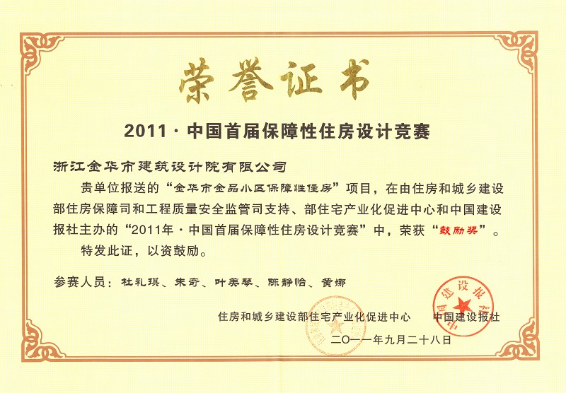 本院設計的“金品小區(qū)保障性住房”在住房和城鄉(xiāng)建設部舉辦的“2011年·中國首屆保障性住房設計競賽”中獲獎,并于第十屆中國國際住宅博覽會上舉行頒獎典禮。本次競賽的主題定為“以人為本,安居樂業(yè)”。旨在更好的推廣優(yōu)秀的保障性住房規(guī)劃設計方法,促進保障性安居工程設計和建設的標準化和模數(shù)化。